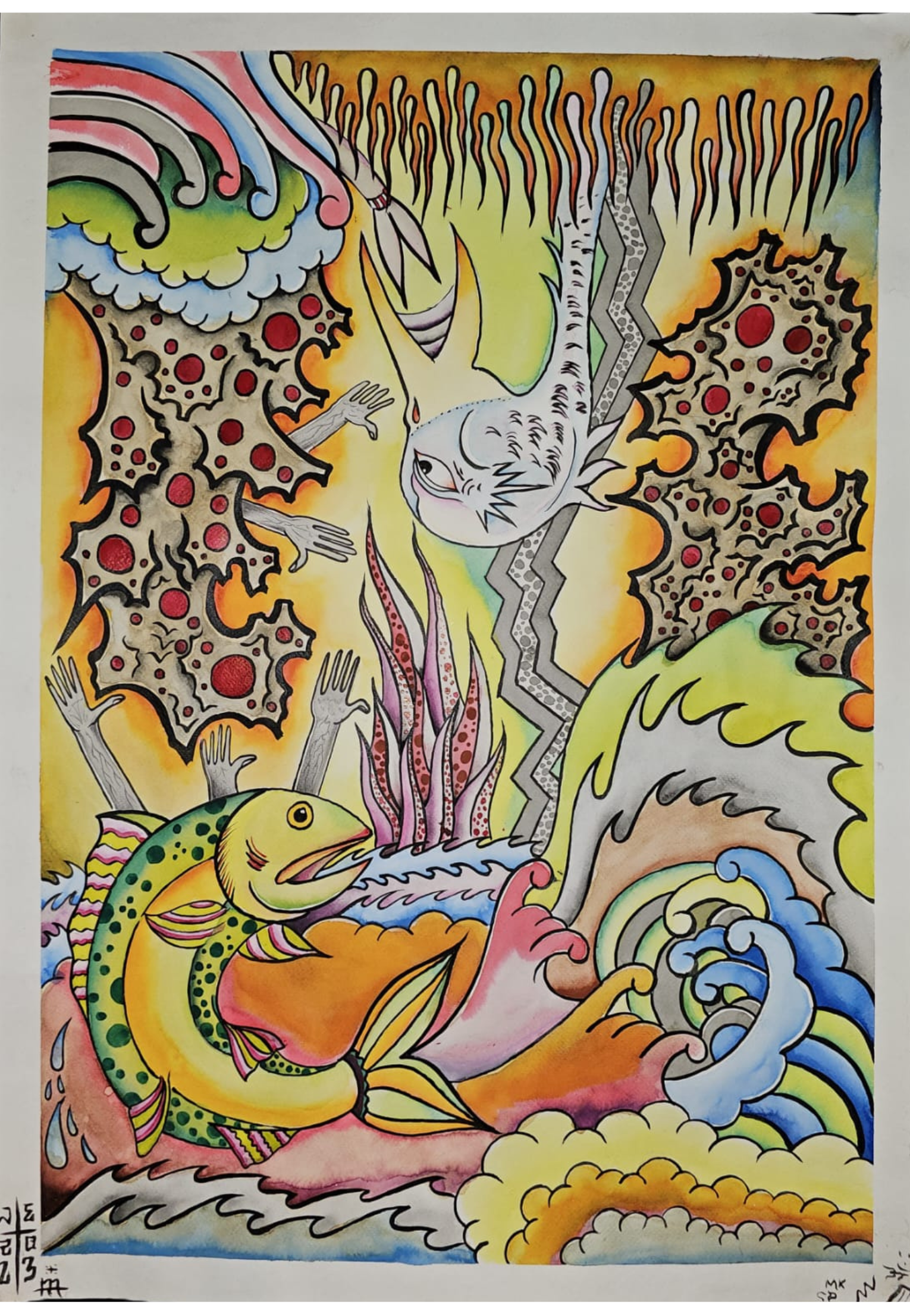 En esta obra, un pez colorido y una garza se encuentran en un mundo surreal lleno de elementos fluidos y orgánicos, representando la tensión y armonía entre fuerzas opuestas. Las corrientes de agua y fuego fluyen de manera impredecible, mientras las criaturas parecen nadar hacia destinos diferentes en un entorno lleno de manos que emergen, como buscando interactuar o influir en su trayectoria. La composición nos sumerge en un espacio donde los colores vibrantes y las formas abstractas evocan un ciclo de transformación y caos. Los detalles minuciosos de cada elemento, desde los animales hasta las texturas ondulantes, invitan al espectador a una introspección sobre los constantes cambios de la vida y las fuerzas invisibles que moldean nuestro camino.