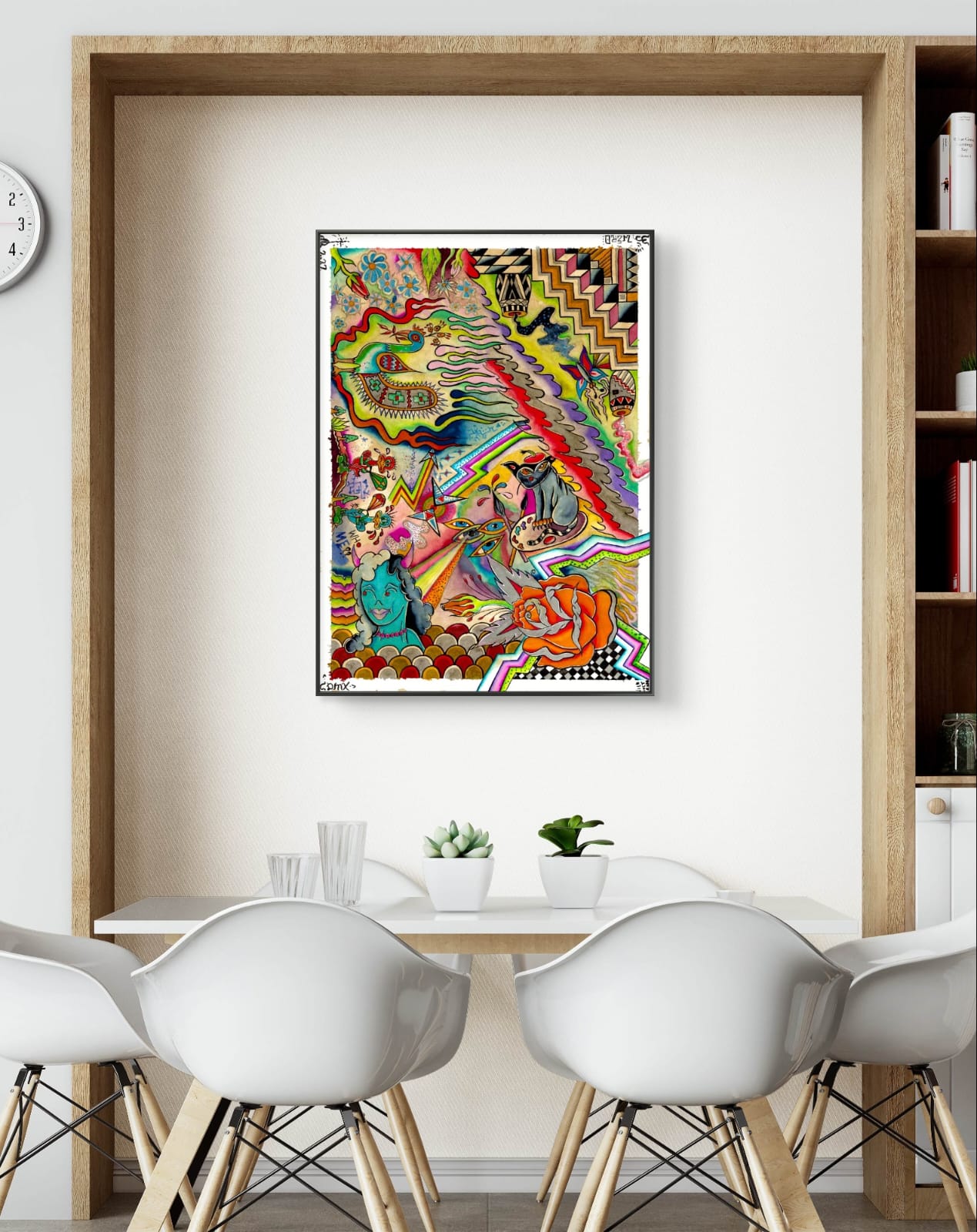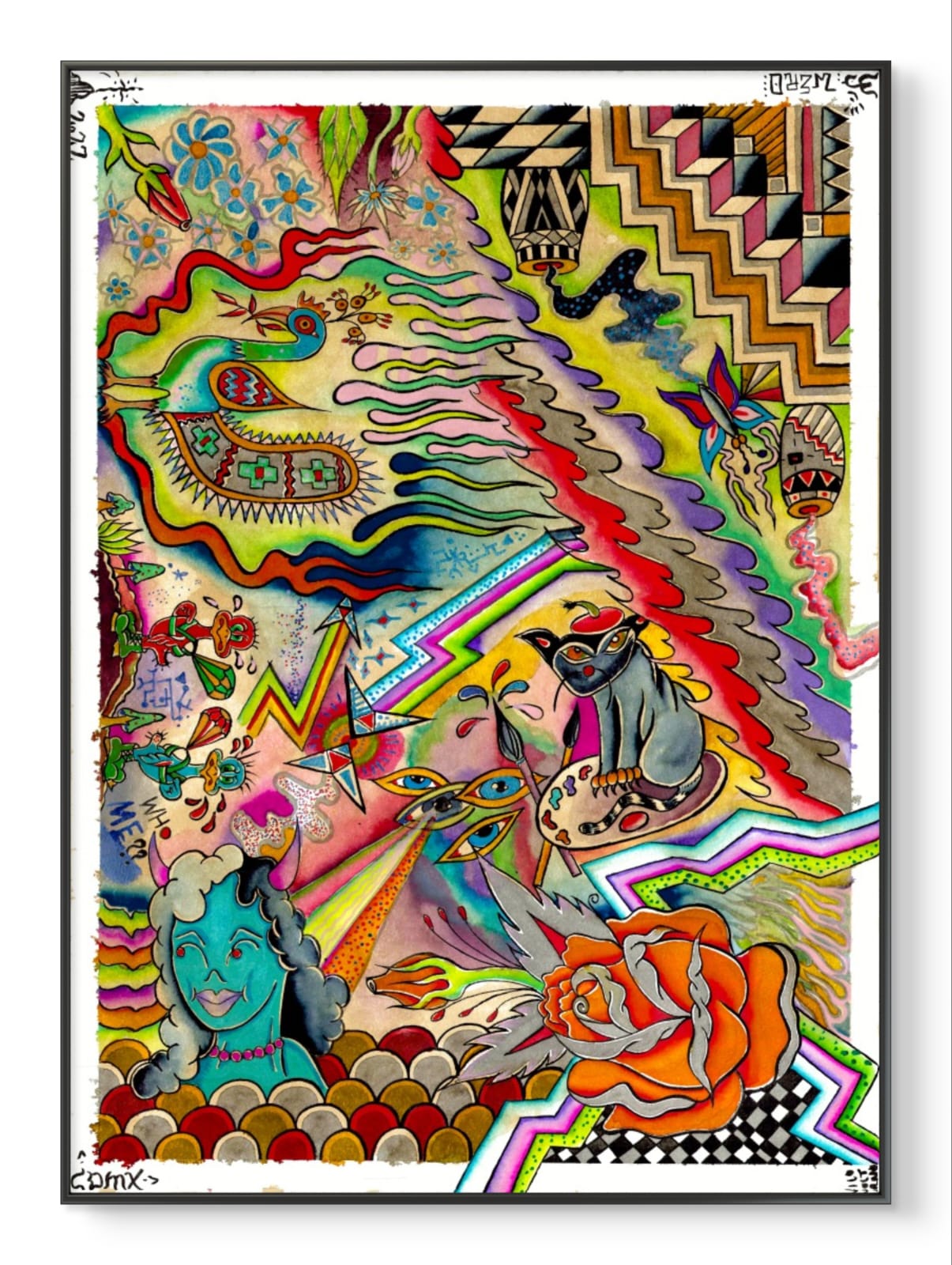 Una explosión visual de color y forma, un collage de elementos surrealistas y vibrantes que capturan la esencia del caos organizado. La composición gira en torno a una amalgama de figuras y símbolos que parecen flotar y entrelazarse en un espacio sin límites definidos. Cada detalle está meticulosamente plasmado, desde las criaturas fantásticas hasta los intrincados patrones, creando una obra que desafía la percepción y provoca la imaginación.