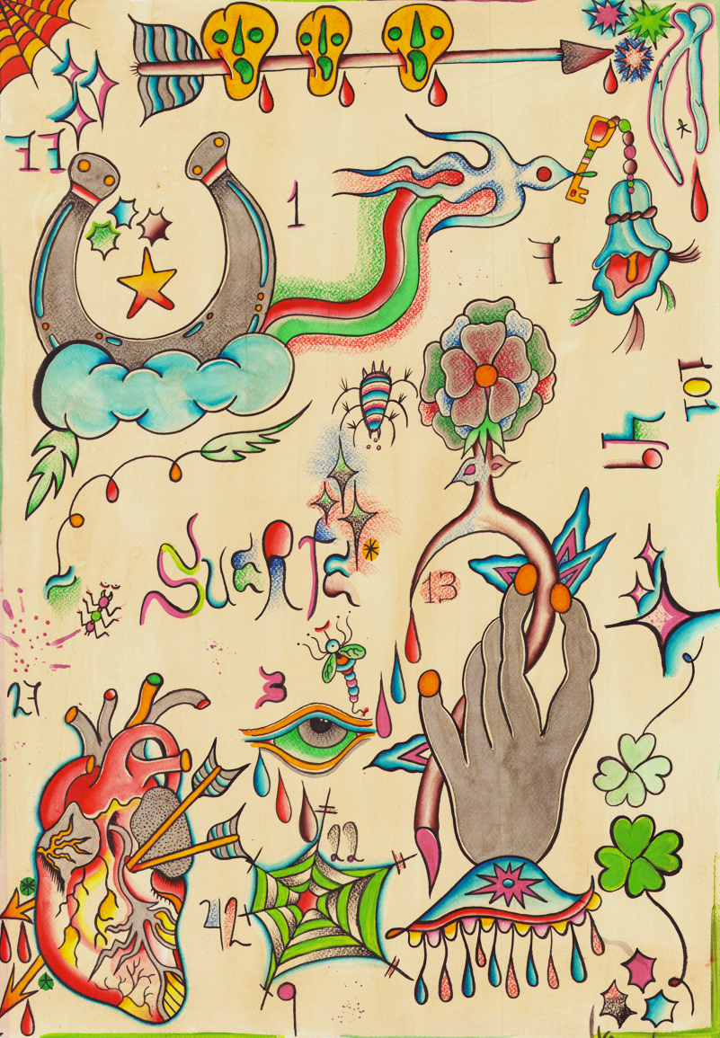 Es una exploración visual de la sutileza y la complejidad, donde elementos dispersos fluyen hacia un conjunto armonioso. Este lienzo se convierte en un campo de juego para los sentidos, donde cada símbolo y forma invita a una contemplación más profunda. Las líneas fluidas se entrelazan con figuras abstractas, creando un diálogo entre lo tangible y lo etéreo. La paleta de colores vibrantes junto con detalles meticulosos, potencian la percepción de un espacio donde la realidad se entremezcla con la fantasía.