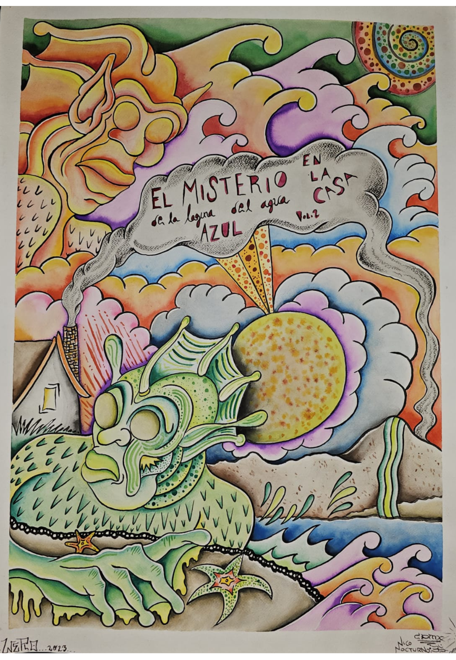 Un viaje a lo desconocido se despliega ante nuestros ojos en esta obra llena de fantasía y surrealismo. El centro de la escena es dominado por una criatura marina con expresiones humanas, emergiendo de una laguna bajo un cielo lleno de nubes coloridas y formas abstractas. Sobre ella, el título flota como un enigma, sugiriendo una narrativa oculta detrás de cada línea y curva. Un ser alado vigila desde las alturas, como un espectador omnipresente de este mundo onírico, mientras el humo de una chimenea conecta lo terrenal con lo fantástico. Cada detalle parece formar parte de un rompecabezas visual que invita al espectador a descifrar su propio "misterio". Las vibrantes tonalidades y la riqueza de las formas te sumergen en una historia que desafía las fronteras entre lo real y lo imaginario.