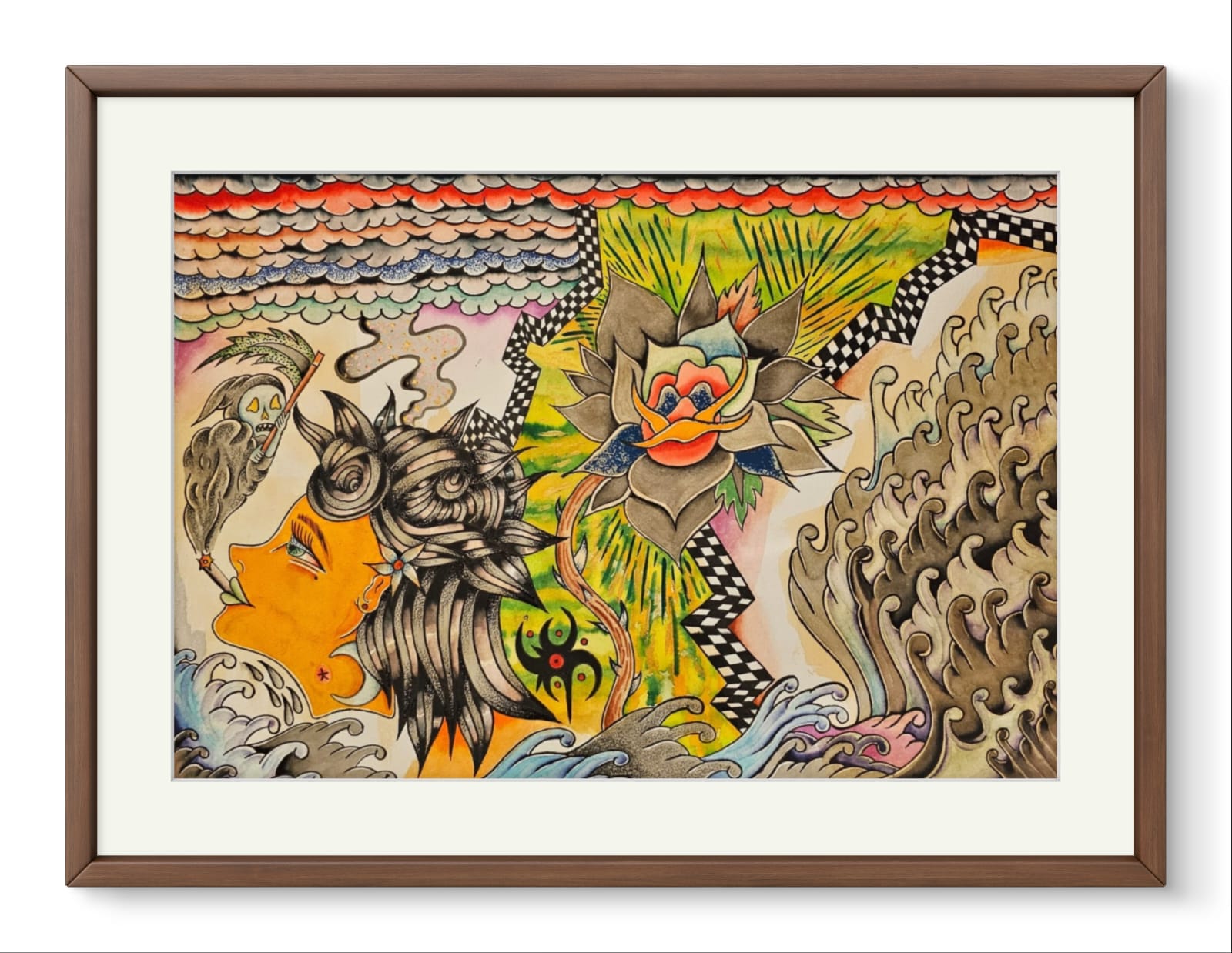 Una composición vibrante y surreal que explora la conexión entre la naturaleza y la mente humana. Una figura femenina, rodeada por formas abstractas, mira hacia arriba contemplando su destino. Una rosa gigante florece a su lado, con colores intensos que contrastan con las nubes multicolores y las olas que emergen en el fondo. Elementos como una calavera con una guadaña y patrones geométricos completan la escena, generando una mezcla entre lo onírico y lo simbólico. La obra invita al espectador a reflexionar sobre la dualidad entre la belleza y lo efímero, entre la vida y la muerte, creando una narrativa abierta a múltiples interpretaciones.