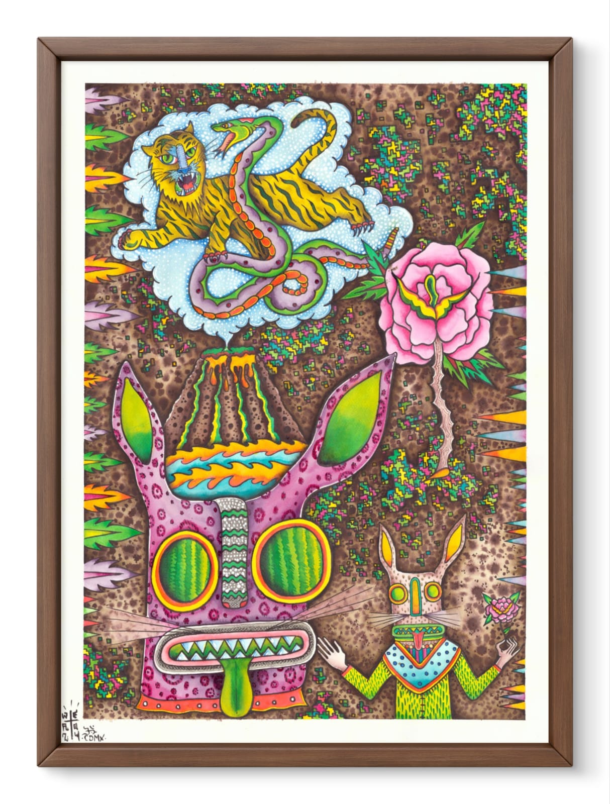 En esta composición, un tigre se encuentra atrapado en un enigmático encuentro con una serpiente, mientras que un personaje enmascarado observa desde un lado. La flor en el centro simboliza una conexión entre el mundo terrenal y el espiritual, dando paso a un ambiente surrealista y psicodélico. La obra invita al espectador a explorar un sueño donde la naturaleza y las criaturas mitológicas se entrelazan en una danza vibrante de color y energía.