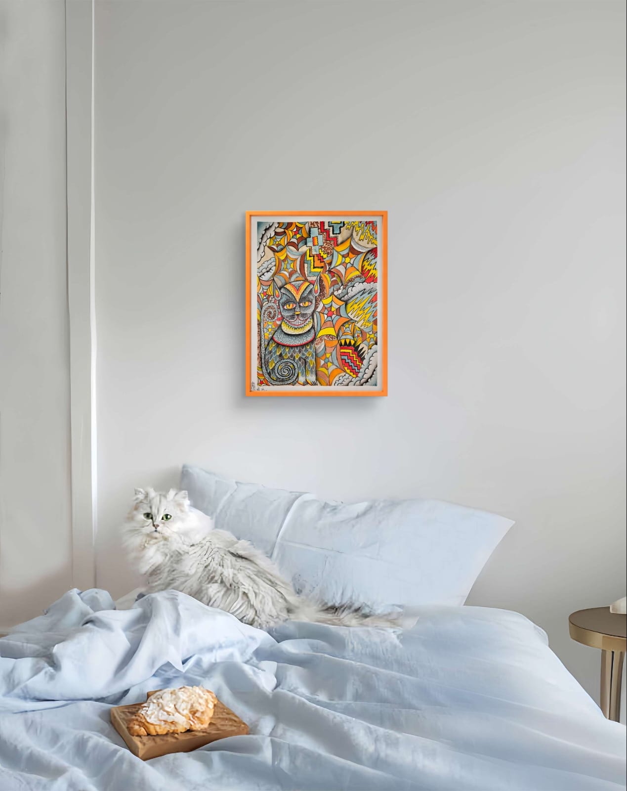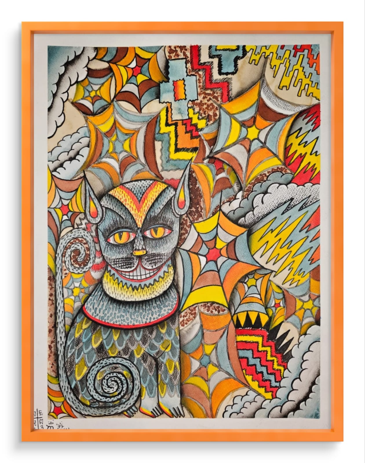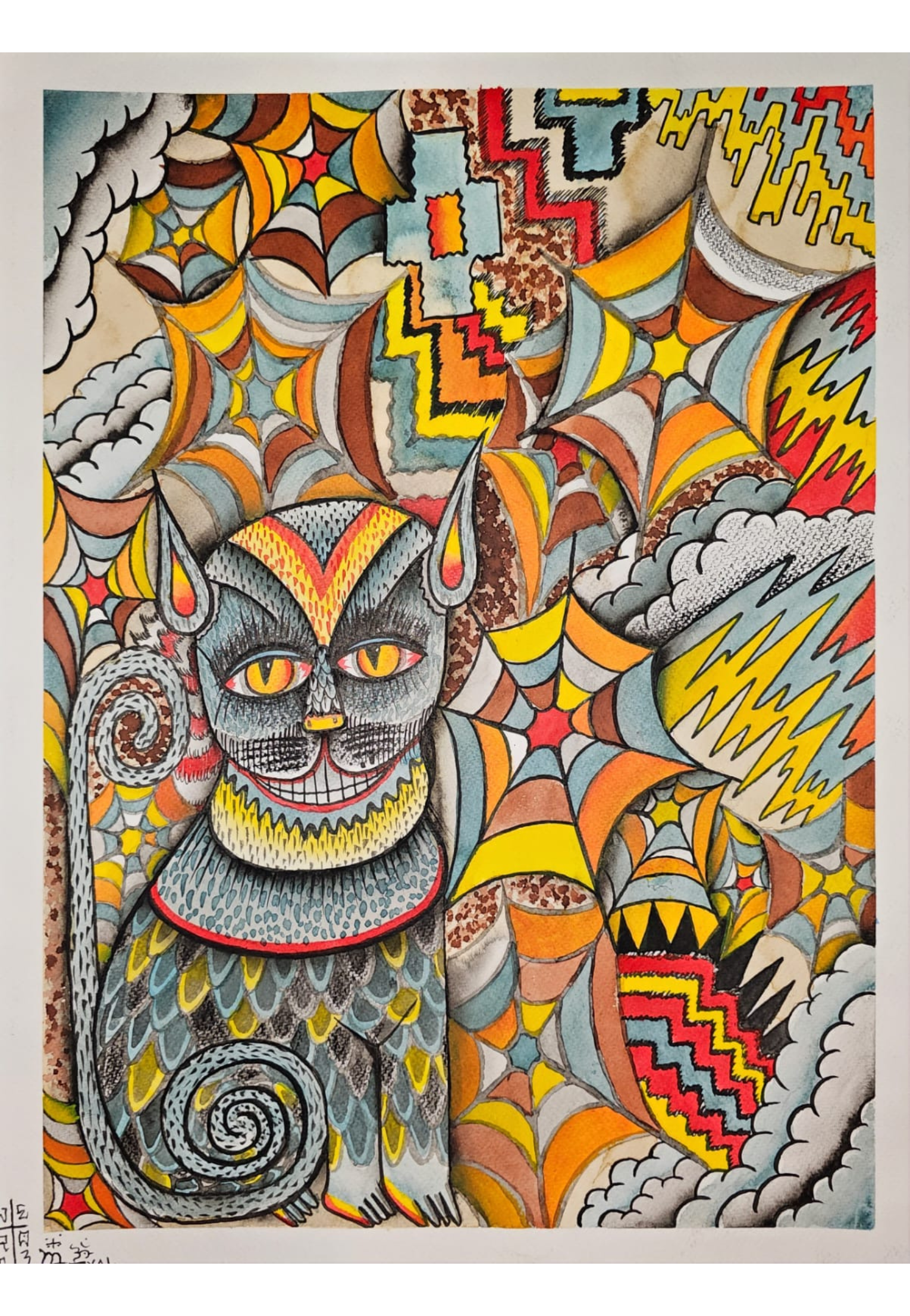 Un felino de ojos penetrantes se entrelaza en un mundo de patrones y colores envolventes, generando una atmósfera de intriga y misterio. Las formas abstractas que rodean al animal evocan redes complejas, como si la figura estuviera atrapada en un laberinto de símbolos y texturas. Cada elemento parece contar una historia oculta, invitando al espectador a perderse en el juego de detalles y significados. Esta obra explora la dualidad entre lo visible y lo secreto, entre la belleza salvaje y la complejidad de lo abstracto.
