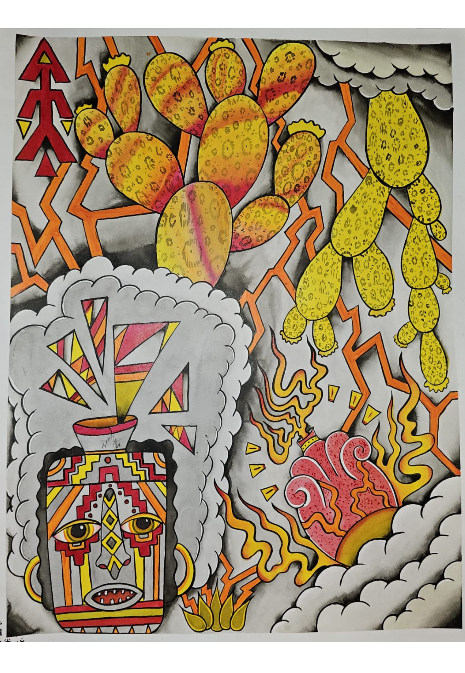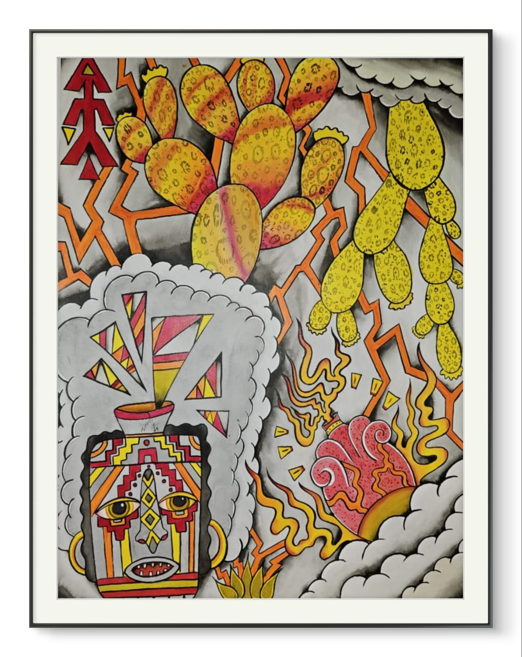 Esta obra explora el simbolismo tradicional mexicano, fusionando elementos abstractos y geométricos con imágenes icónicas de la flora desértica y símbolos prehispánicos. Los nopales en primer plano, con sus colores vibrantes y texturas llamativas, contrastan con el fondo de nubes y relámpagos, evocando una tensión entre la naturaleza y la energía cósmica. Al centro, un jarrón ceremonial cobra vida, con patrones intrincados que sugieren una conexión con el fuego y el renacimiento. El uso de los colores cálidos y las formas angulosas refuerza la sensación de movimiento y transformación en la composición, invitando al espectador a reflexionar sobre la identidad, la cultura y la naturaleza espiritual que subyace en todo. Es una pieza que equilibra lo ancestral con lo contemporáneo, creando un diálogo visual entre lo sagrado y lo mundano.
