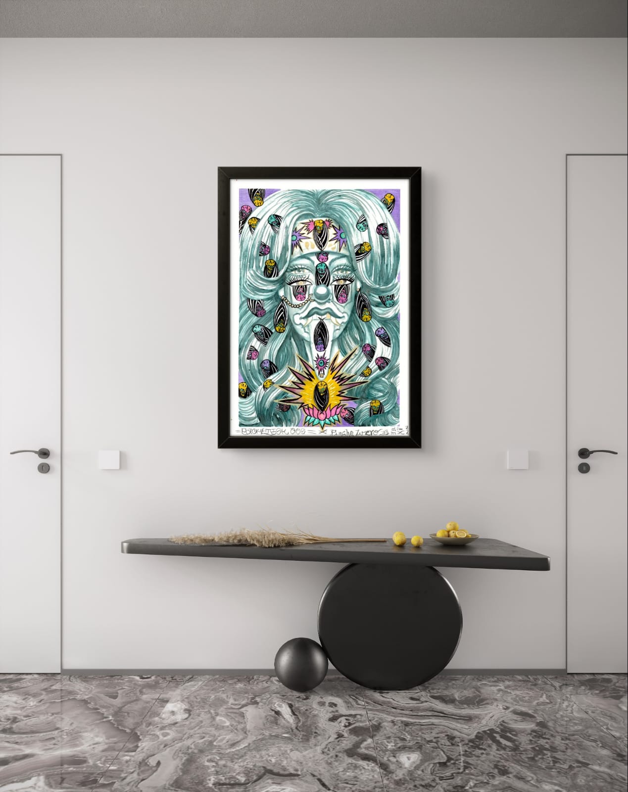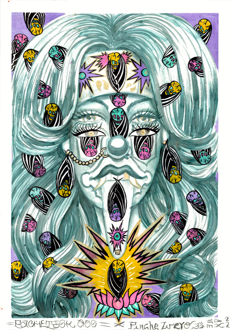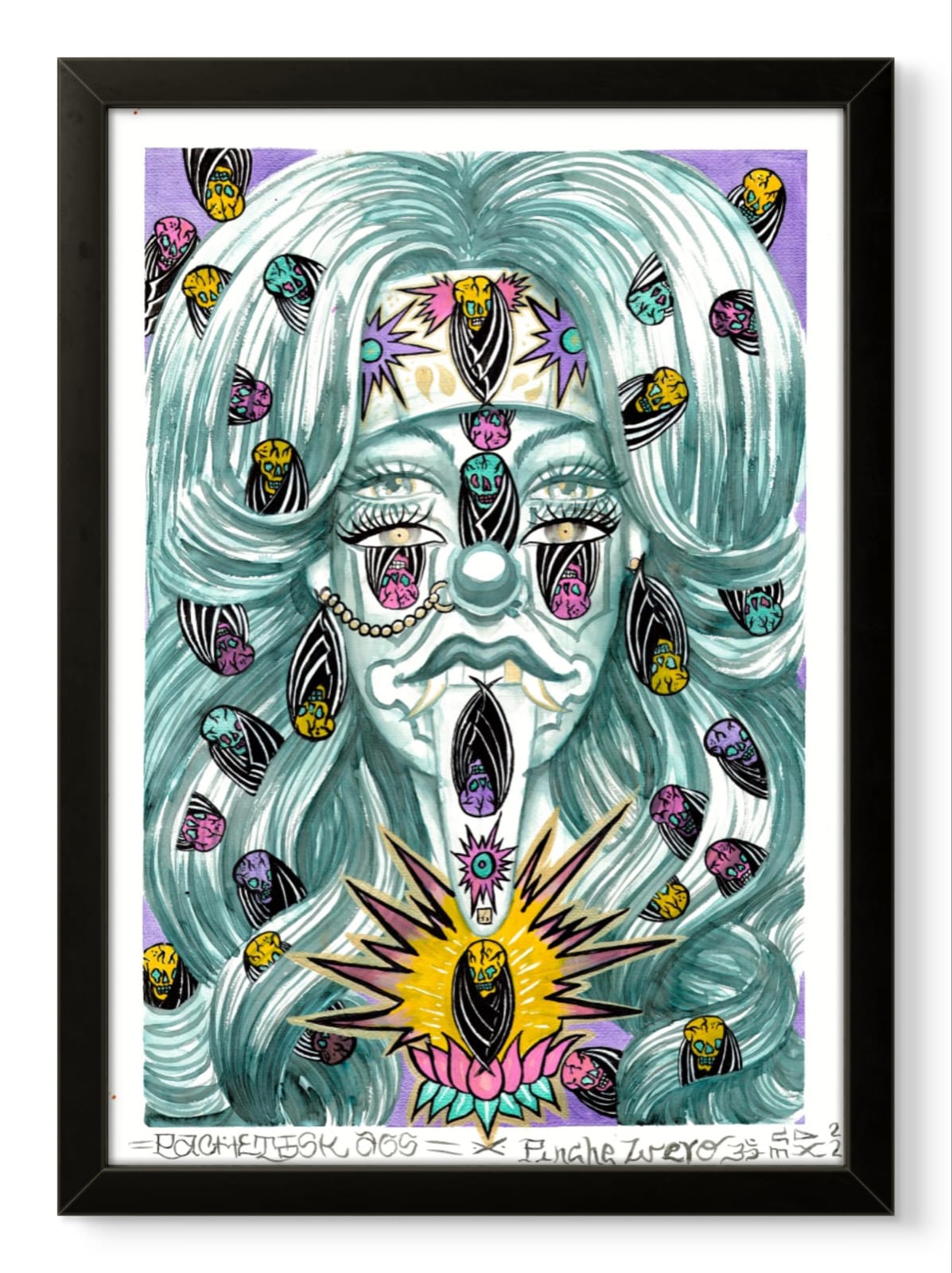 Esta pieza es una colaboración entre Pinche Wero y Pachetisk, donde se fusionan elementos culturales en una representación de la diosa Kali en estilo cholo. Capturando su esencia destructiva y transformadora, simbolizando los atributos típicos de Kali como la muerte, el tiempo y el renacimiento, acentuada con detalles en colores vividos. El toque de modernidad y tradición se entrelaza a través de símbolos y patrones que evocan tanto el folclore como el arte urbano contemporáneo, creando un retrato poderoso que rinde homenaje a la dualidad de la creación y la destrucción.