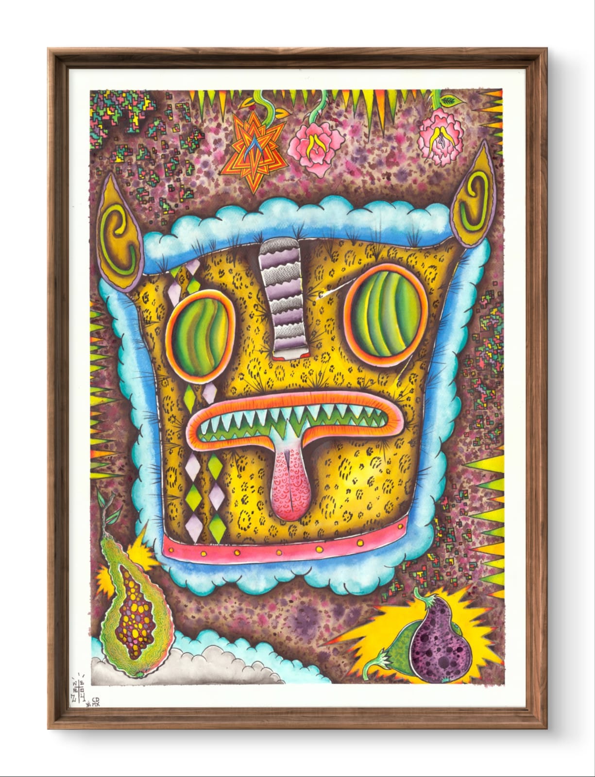 Esta obra nos revela una máscara enigmática y cósmica, cuyo diseño recuerda las máscaras tribales, pero con una interpretación moderna y surrealista. Los ojos, intensos y llenos de color, parecen observar al espectador desde un mundo paralelo. La textura del fondo y los elementos orgánicos que lo rodean crean una atmósfera mística, como si esta figura estuviera conectada con las fuerzas de la naturaleza y el universo.