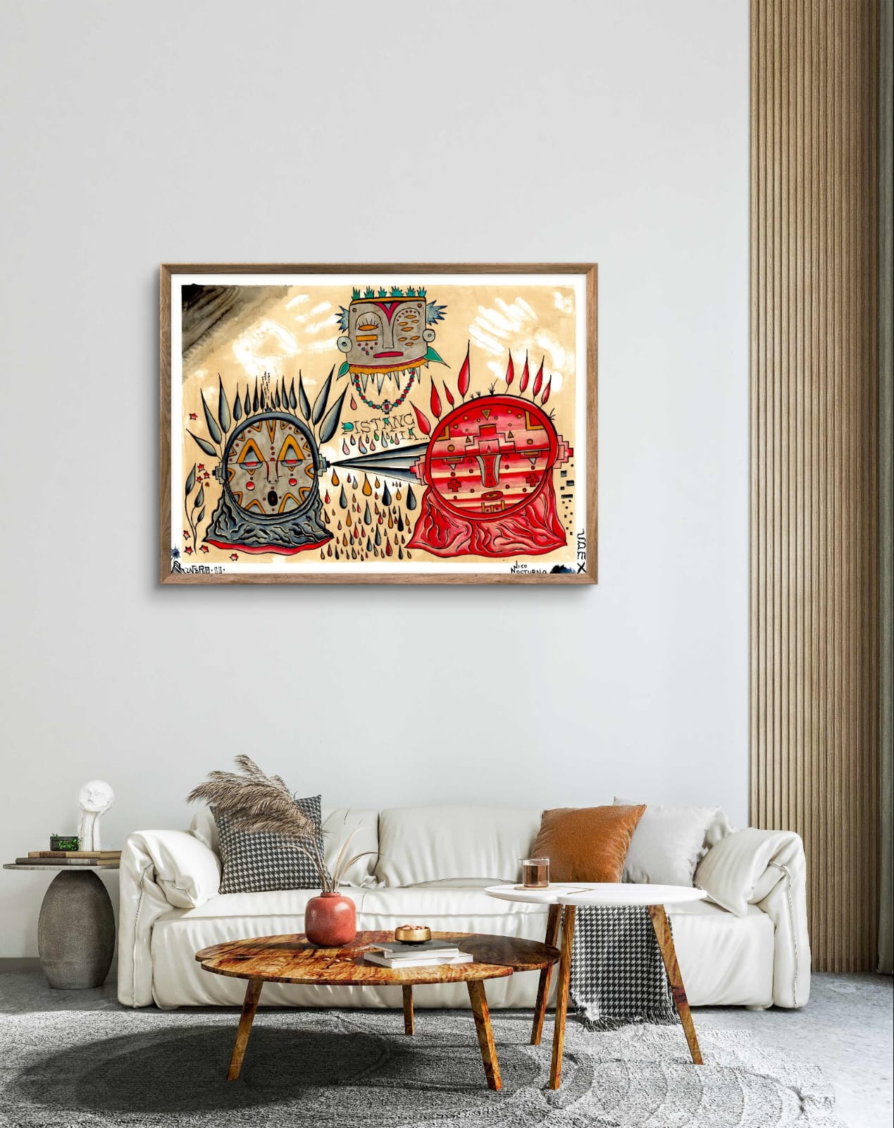 En esta obra, se presentan figuras enmascaradas que parecen emerger de un espacio desconocido, rodeadas de símbolos y patrones que sugieren secretos antiguos y rituales arcanos. Cada máscara representa una identidad diferente, envuelta en un entorno enigmático de lágrimas, llamas y formas geométricas que evocan dualidades y misterios. El contraste de colores y detalles intrincados invita al espectador a descifrar las historias ocultas detrás de cada rostro, explorando la conexión entre lo visible y lo invisible, lo conocido y lo desconocido.
