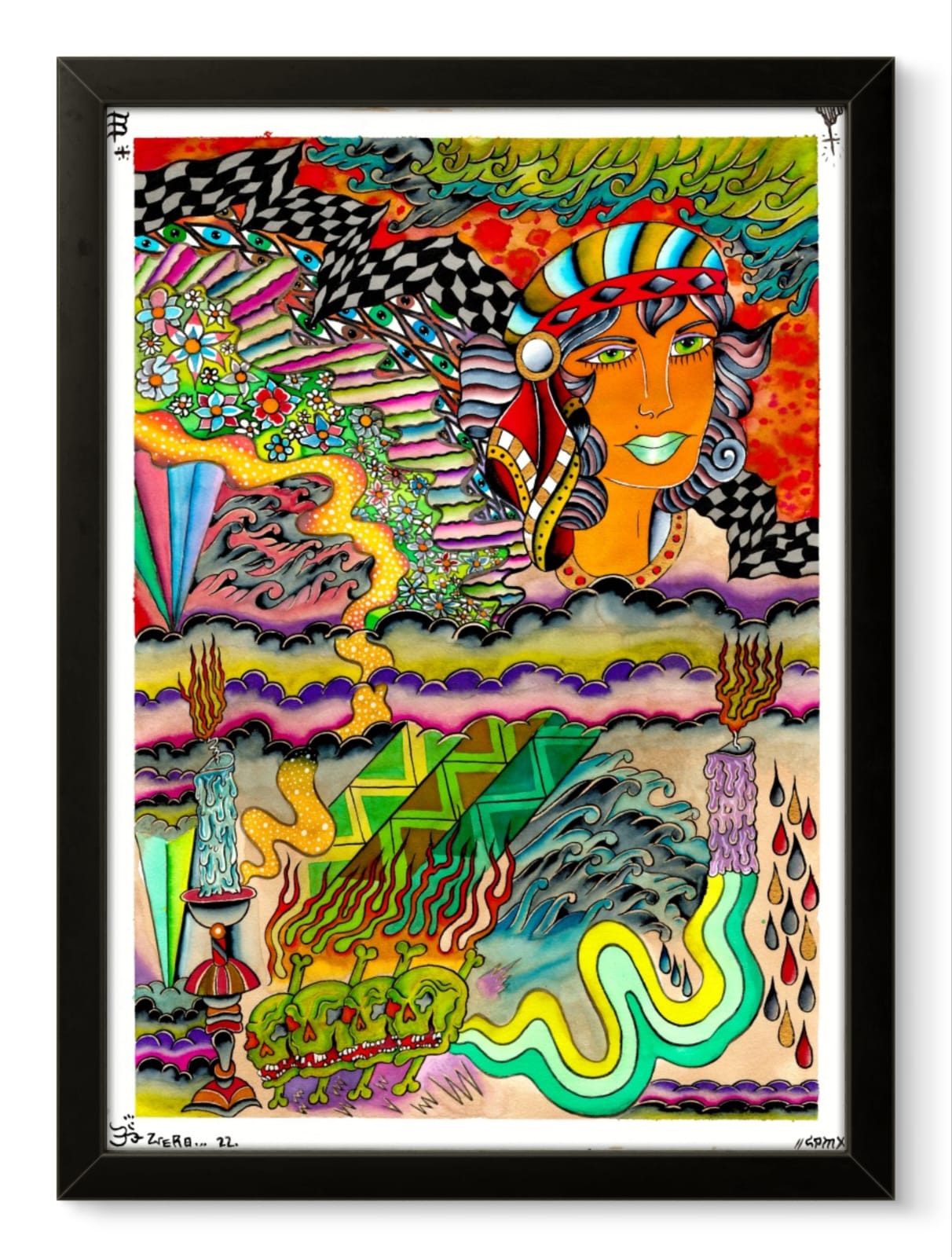 Esta vibrante composición nos invita a un viaje a través de los recovecos más profundos de la mente y el espíritu. Con una mezcla audaz de colores vivos y figuras simbólicas, la obra explora la interacción entre la conciencia y los sueños. La presencia central de un rostro, adornado con elementos que sugieren tanto sabiduría como enigma, actúa como el guardián de los secretos internos. A su alrededor, la naturaleza y los símbolos abstractos danzan en una celebración de la vida y sus misterios ocultos.