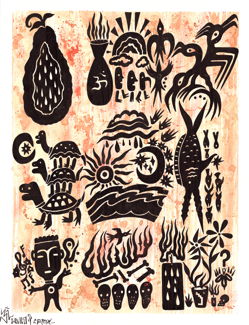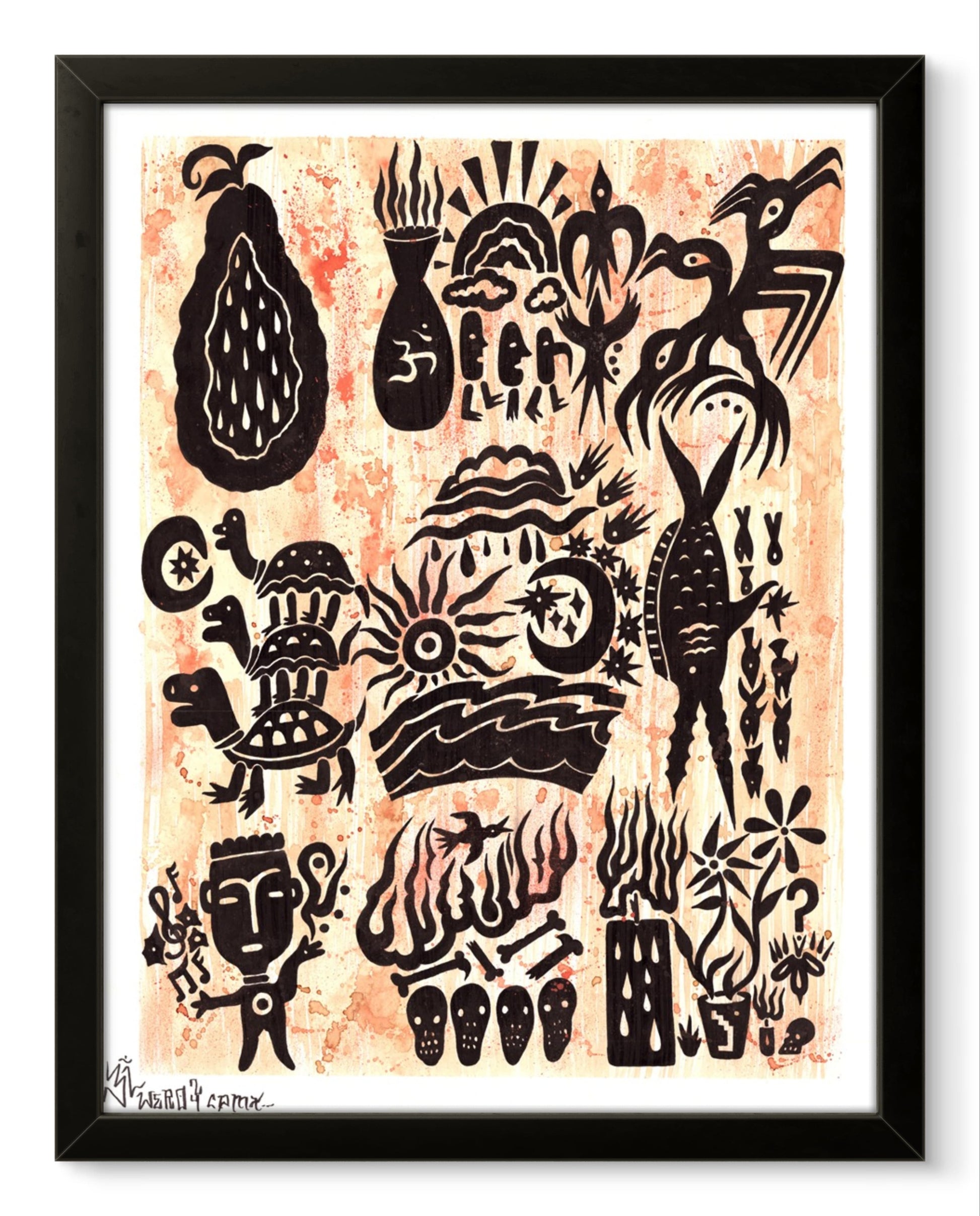 Una composición intrigante que explora la profundidad y simplicidad del contraste entre el negro y el fondo cálido. Cada silueta parece contar una historia distinta, fusionando elementos de la naturaleza, la humanidad y lo abstracto. Las formas negras evocan un simbolismo ancestral, invitando al espectador a interpretar libremente los motivos y a sumergirse en un mundo de misterio y conexión. La textura del fondo añade una dimensión cálida y orgánica, complementando la intensidad de las figuras.