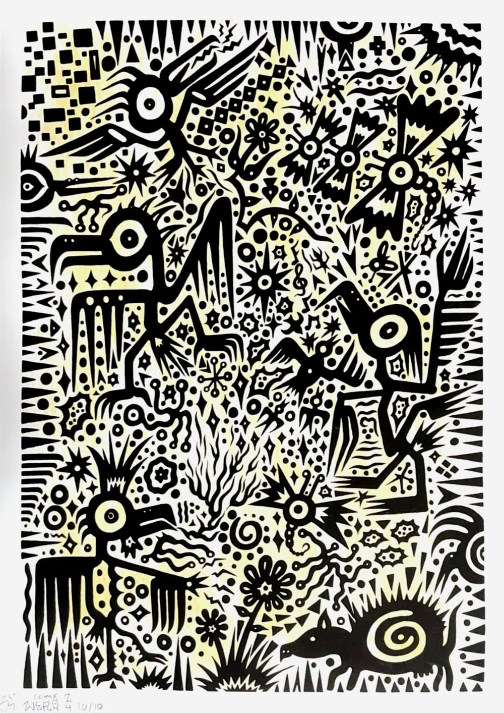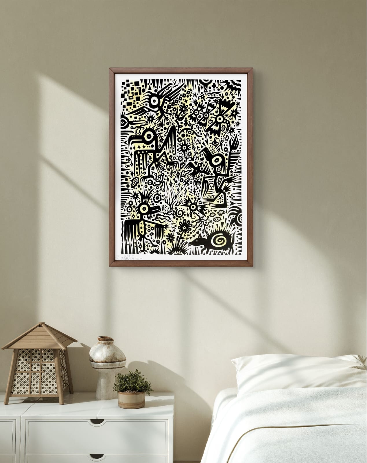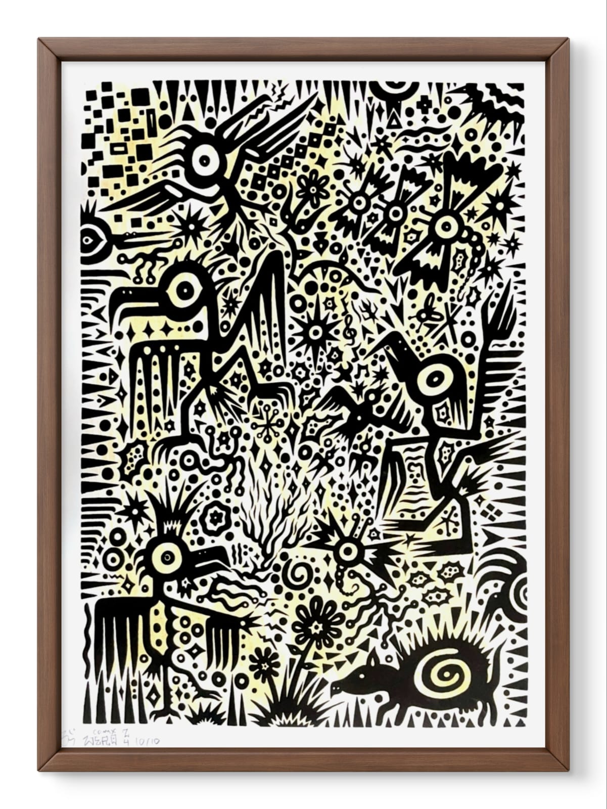 Una obra que explora la conexión entre lo salvaje y lo simbólico a través de un intrincado diseño en blanco y negro. Esta serigrafía captura una explosión de formas abstractas que evocan aves, criaturas y plantas, invitando al espectador a sumergirse en un paisaje lleno de movimiento y misterio. Cada detalle, desde las líneas dinámicas hasta los elementos geométricos, genera un ritmo visual único que resuena con energía caótica y belleza orgánica. Esta pieza es una celebración de la vida y sus ciclos perpetuos, una narrativa visual que cada espectador puede interpretar desde su propia perspectiva.