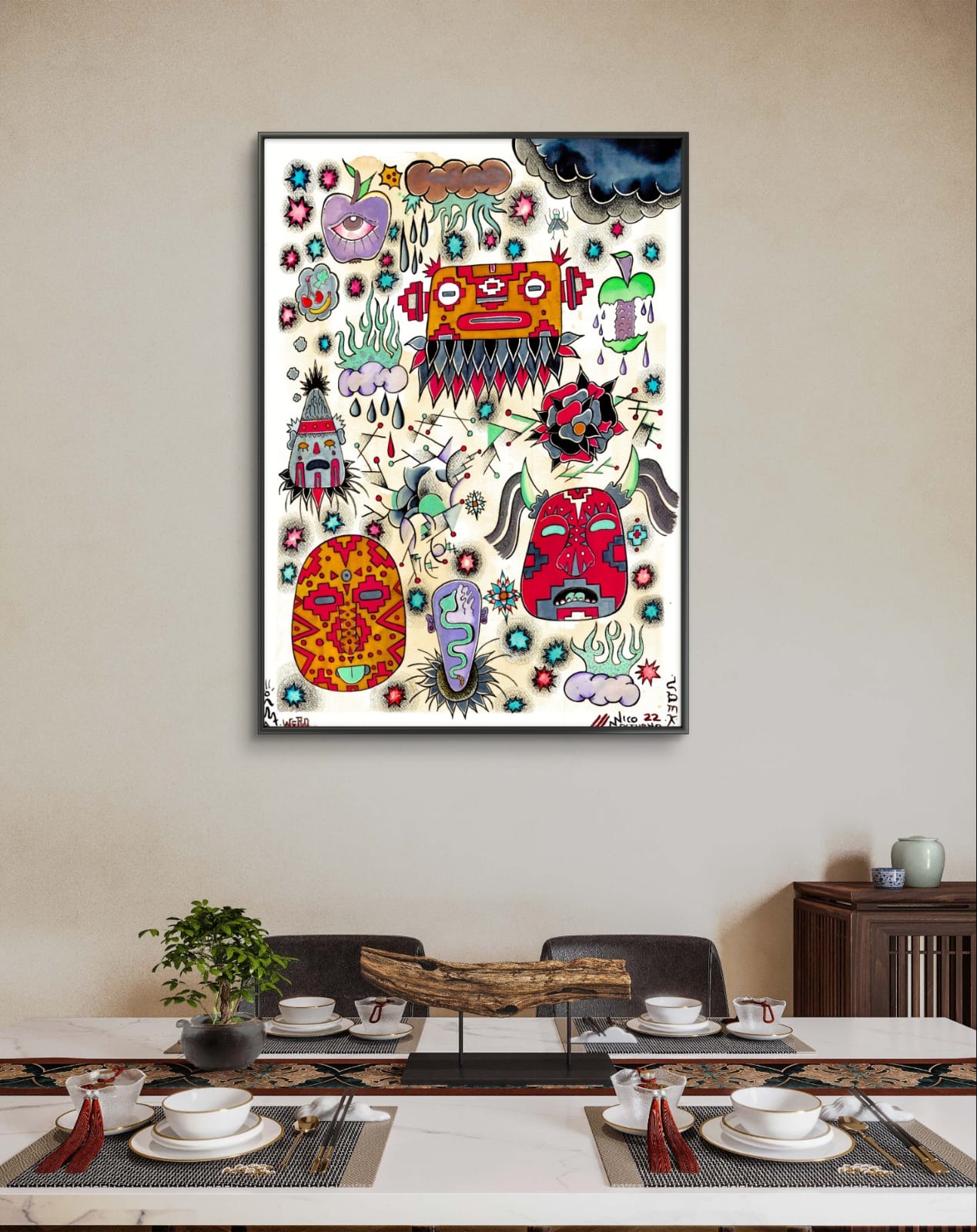 Un despliegue de formas y colores que evocan la presencia de antiguos guardianes y rituales perdidos en el tiempo. La obra combina elementos simbólicos como máscaras de diferentes patrones y colores, figuras abstractas y detalles que sugieren movimientos y transformaciones espirituales. Cada símbolo parece interactuar en un baile místico bajo cielos estrellados y fragmentos geométricos, invitando al espectador a explorar las historias ocultas detrás de cada trazo y color.
