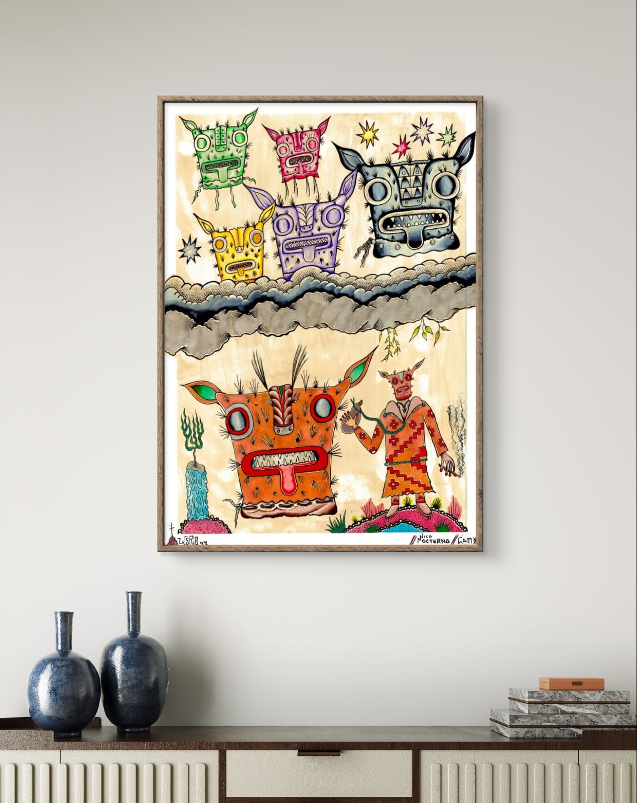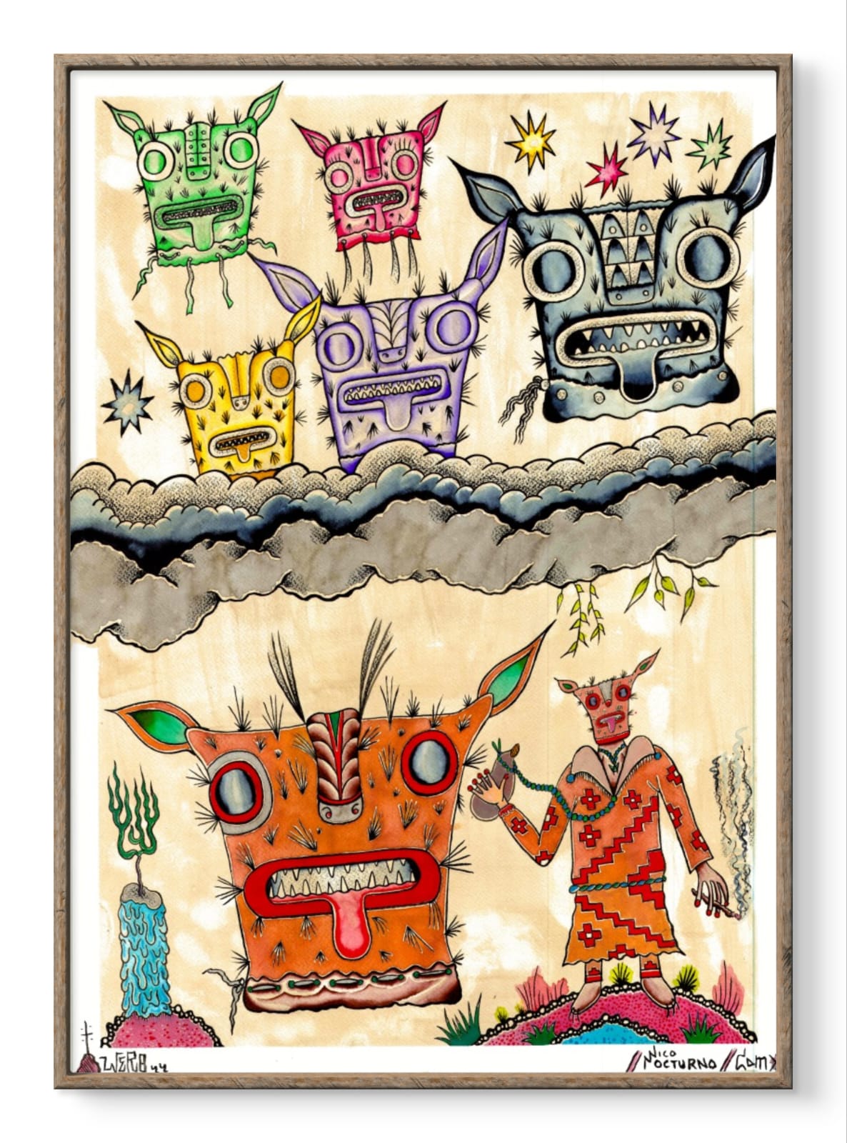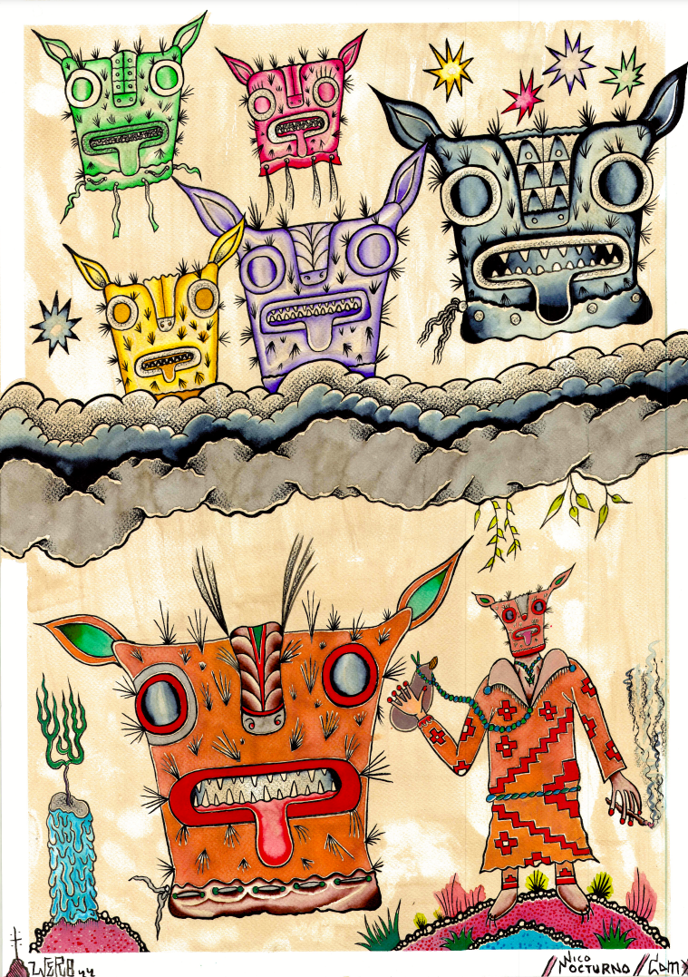 La obra captura una escena mística donde figuras enmascaradas se despliegan en un paisaje etéreo. Cada personaje parece custodiar secretos y transmitir mensajes ancestrales a través de sus gestos y colores vibrantes. La presencia de una figura que sostiene un cigarro y parece conversar con las máscaras flotantes sugiere un ritual o un encuentro de revelación espiritual. Este diálogo visual se intensifica con detalles que remiten a símbolos tribales y elementos naturales que enmarcan la composición, llevando al espectador a un mundo donde lo desconocido se encuentra con lo familiar.