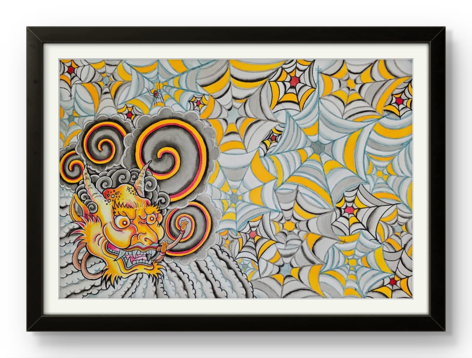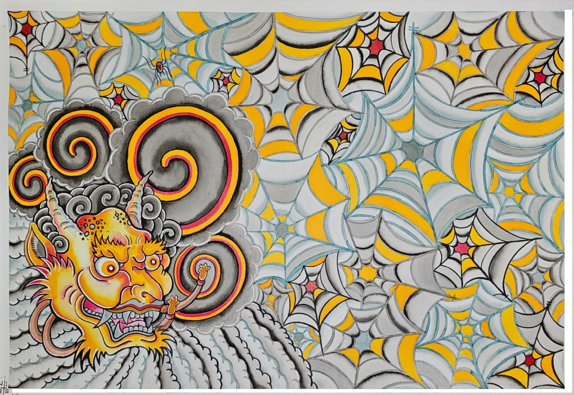 Esta vibrante obra fusiona la intensidad del arte tradicional japonés con un estilo contemporáneo, representando la figura de un Oni (demonio japonés) envuelto en una tormenta de nubes espirales y telarañas, simbolizando caos y poder. El uso de colores contrastantes, como el amarillo intenso, el negro y el rojo, resalta la fuerza y energía de la criatura mitológica, mientras que los patrones geométricos en el fondo crean un equilibrio hipnótico entre orden y desorden.